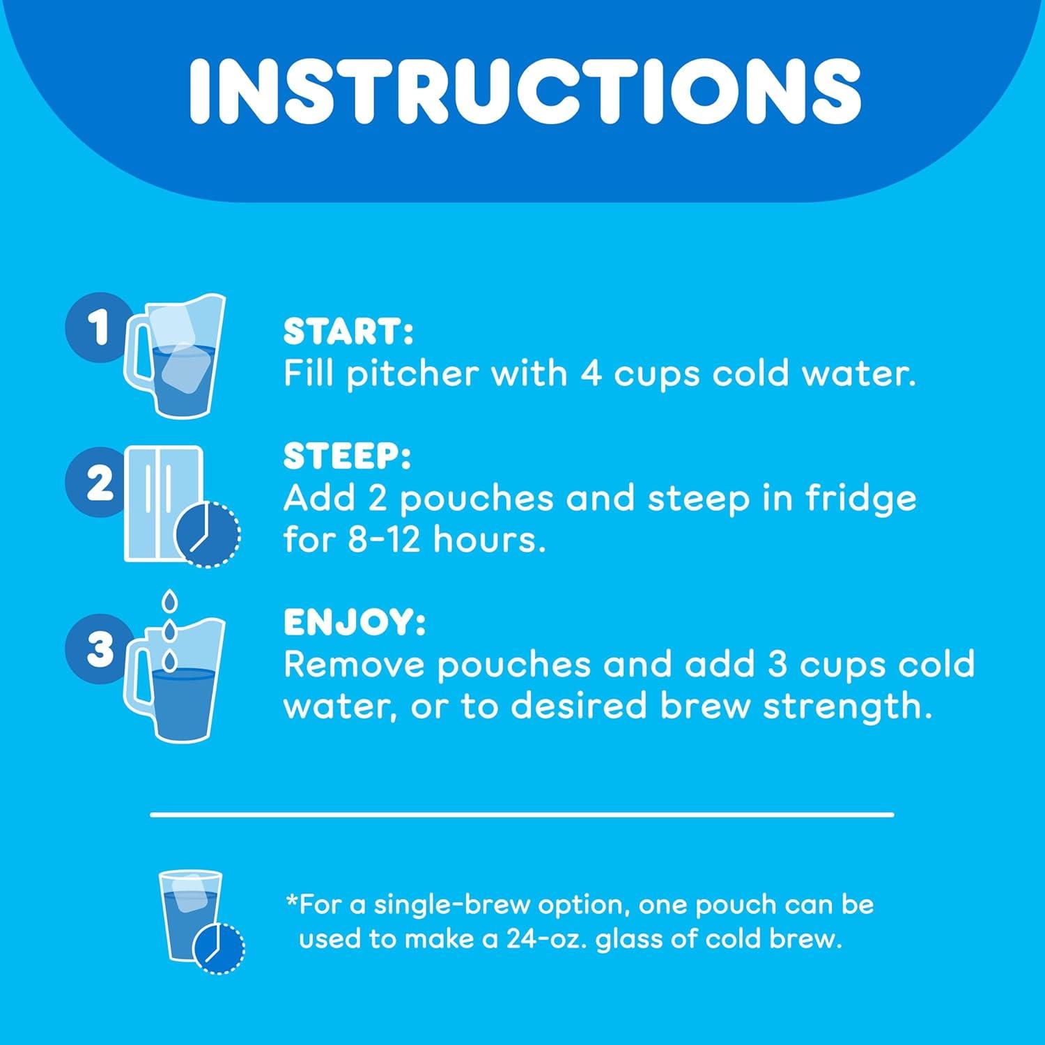 Get cold brew coffee right from your refrigerator with Dunkin’ Cold Brew coffee packs. This specially crafted blend delivers the smooth, bold, full-bodied brew you crave in a few simple steps. Just drop two coffee packs into four cups of water and allow them to steep in your fridge overnight (8-12 hours). Then, remove the pouches and add 3 cups of cold water, or as much as you need to achieve your desired brew strength. All that’s left is to sit back and relax, enjoying your cold brew for up to a week. Drink it straight from the pitcher or customize it with your favorite creamer and sweetener — either way, that rich Dunkin’ taste is just a few steps away.