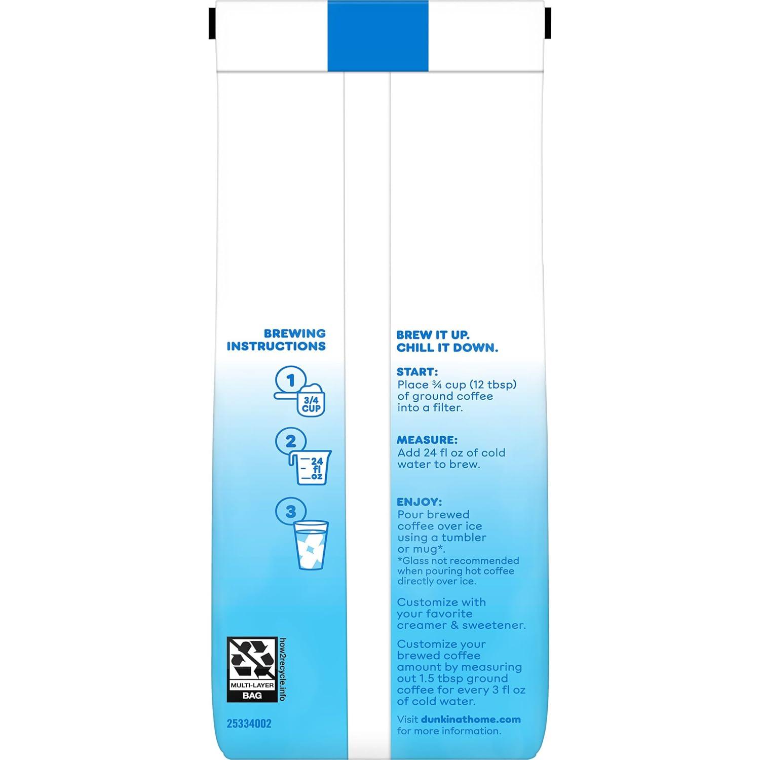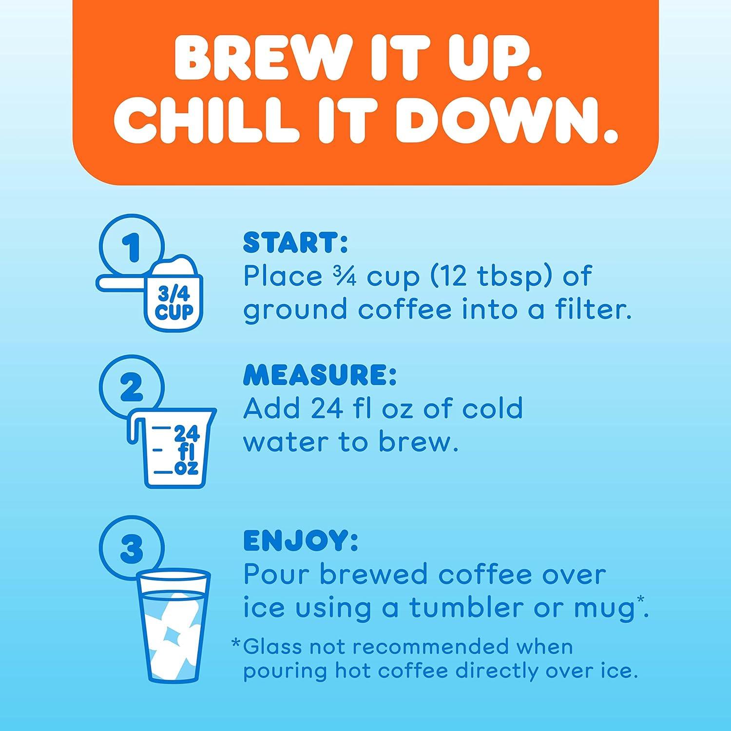 When making iced coffee at home, you need something bold to take on the cold. Dunkin’ Cold ground coffee steps up to the task. It’s specially roasted for cold coffee that stands up to ice, giving you a smooth, bold taste packed with the Dunkin’ flavor you crave. To prepare, refer to the suggested amount of grounds on pack and brew them in your coffee maker like a regular pot of hot coffee. Pour immediately over ice in a mug or tumbler (glass not recommended when pouring hot coffee directly over ice). Then, just sit back and relax with your smooth and refreshing Dunkin’ Cold coffee. Or, add in your favorite creamer and sweetener for an even more personalized experience. Easy, convenient and, most importantly, delicious.
