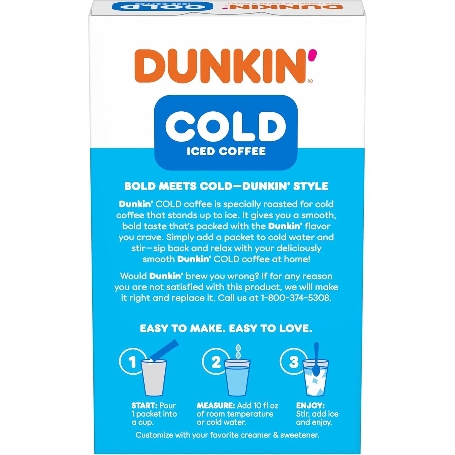 When making iced coffee at home, you need something bold to take on the cold. Dunkin’ Cold powdered instant coffee packets step up to the task — and make it beyond convenient. Simply add a packet to cold water, stir, add ice and sip so nice. Or, add in your favorite creamer and sweetener for an even more personalized experience. Either way, you can′t go wrong. Dunkin′ Cold coffee is specially made for a cold coffee that stands up to ice. It′s strong, not watery, with a smooth, bold taste that′s packed with the Dunkin′ flavor you crave. Stock up now to enjoy instant iced coffee anytime.